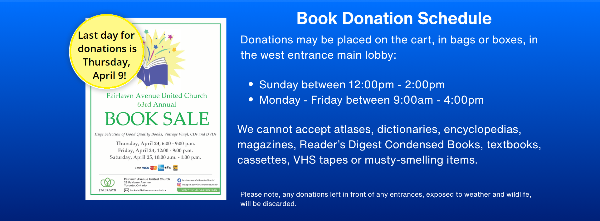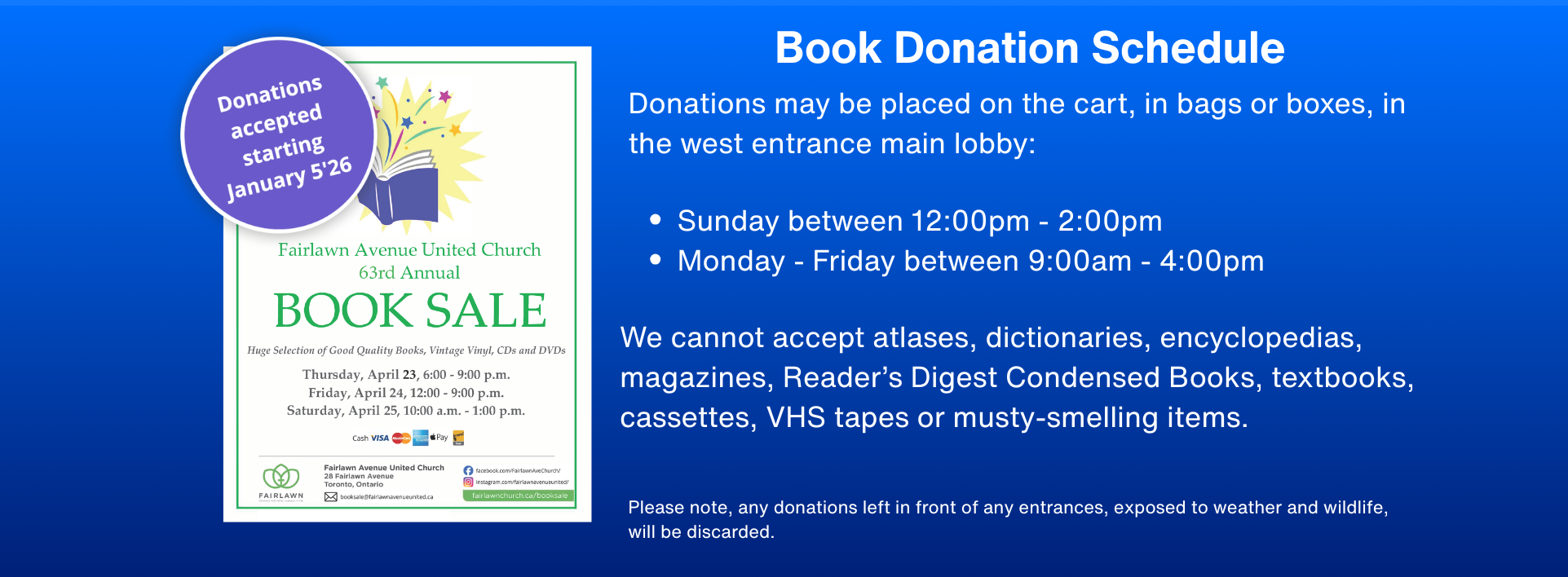 Worship service at Fairlawn Avenue United Church are on Sunday mornings in our Sanctuary with Rev. Dr. Cameron Watts, Eleanor Daley, Director of Music and the Fairlawn Avenue Senior Choir. Enjoy a cup of coffee or tea, in our post-service Coffee Hour in the sanctuary. Coffee Hour provides an important opportunity for people to connect with one another, Experience Belonging, welcome visitors and guests, and feel part of Fairlawn. If you’d like to revisit any of our worship services, curated musical offerings and service bulletins, they are posted online on our website worship page.